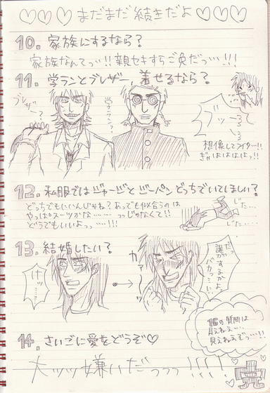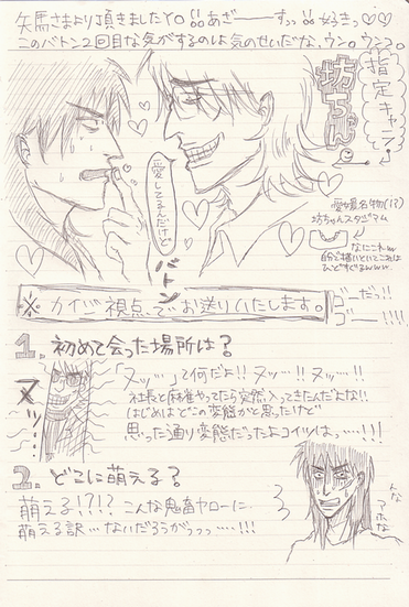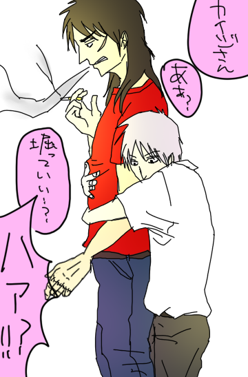 載せるものが無いからすんんんんんんんんんごい昔に描いたカイジでも。 何年前だよこれ。 絵柄が全然ちがうけど画力自体が全くあがってないのが泣き所。 きょうのできごと☆ ――――昨日、一昨日と降り続いていた雨が嘘だったかのように カラリと晴れた日曜の昼下がり。 家の前の小学校からはグラウンドでサッカーをしている子供たちの声が聞こえる。 洗濯物を干した あの心地の良い香りを風が運んでくる。 日の光を浴びようとベランダに出て、煙草の火を付ける。 (外出する予定が無い日に限ってこんなにいい天気とは。) 煙草の火を消し、若干憤りを感じながら部屋に戻ると携帯に一件のメールが。 「ブログ」「新着コメントのお知らせ」 既に起ち上げていたブラウザからコメントを確認する。 c●m●さんだ。来た。 始まりだった。訳のわからないコメント合戦の。 私はこうして引きcomoって半笑いを抑えつつそれを楽しんでいる、 こんな日もあっていいだろう。 窓から差し込む光が眩しい、絶好の外出日和に敢えて引きcomoるのも。 「新着コメントのお知らせ」「新着コメントのお知らせ」 普段鳴らない携帯がこれでもかと言わんばかりに自己主張している。 負けじとコメントを返信する。 しばらくしてコメント合戦も終わり さて。 何をしようか。 考える間もなく次はメッセンジャーが起ちあがる。 相方だった。 暫く雑談を交わし、 「こんな日に何やってんだろうね私ら」「そのことだよ」 やっぱりもったいない。こんな天気の日に外に出ないのは勿体無い。 誘いをかけてみた。 「青春しにいこうぜ!!」「ちょwwwwまじwwwおkwww」 決断は早かった。 直ぐにPCをシャットダウンさせ、外を見る。 ・・・・・・さっきまであんなに晴れていた空がどんよりと曇っている。 気のせいだ。自分に言い聞かせ身支度をととのえる。 その頃にはもう既に 今にも泣き出しそうな空模様だった。 湿った空気が流れ込んでいる。 ・・・・気のせいだ・・・・と、思いたい。 相方を迎えに行き、行き先予定であった海まで向かう途中に とうとう車の窓ガラスにぽつぽつと水滴が落ち始める これは何の嫌がらせだろうか。 目的地に着いた頃には雨は降っていなかったものの、 髪が地面の水平方向になびくほどの強風。 寒い。 寒い。私たちの心が、存在が、今、一番寒い。 分かっているけどお互い口には・・・・・・・・・・・出した。 「寒いよな私ら」「カップルとかありえんよね」「もう死ねよ、・・・・自分らが」 こんなかんじでした>< もっと続きあるけどもう眠たいよおおおおおおおおお 飲んじゃってるんだよおおおおおおおおおおおおおお ふらふらするよオオおおおオオおおおおおおおおおおおおおおおおおお ごめんなさいもう寝ますグウグウ お休みなさーーーーーい!!!!!!! |
